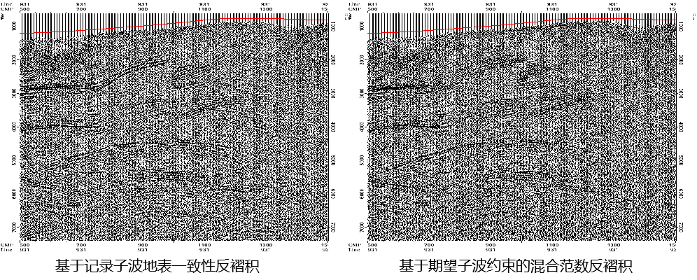基于期望子波的混合范数反褶积方法,采用L1/L2混合范数的超松弛雅克比迭代算法,运算更稳健更高效,并对异常噪声不敏感;根据误差谱计算修正算子,在一定程度上压制异常噪声;对整体数据进行期望子波约束,可灵活调整不同采集数据间的频带差异,增强地震数据一致性。