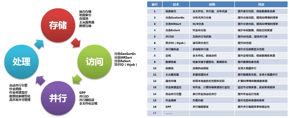针对海量数据从存储、访问到处理,实现作业自动并行、并行分选、数据压缩等关键技术,形成系统化解决方案,系统处理能力由百TB级提升到PB级,压缩海量数据的处理周期。