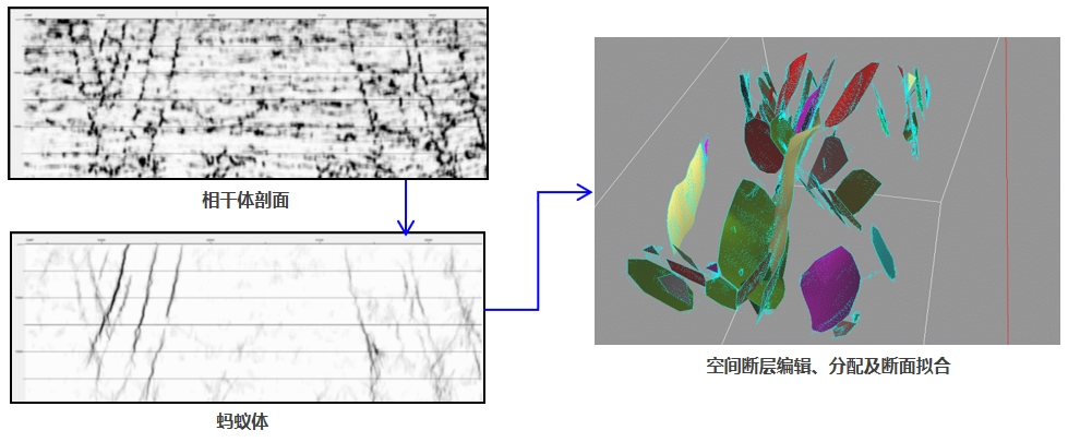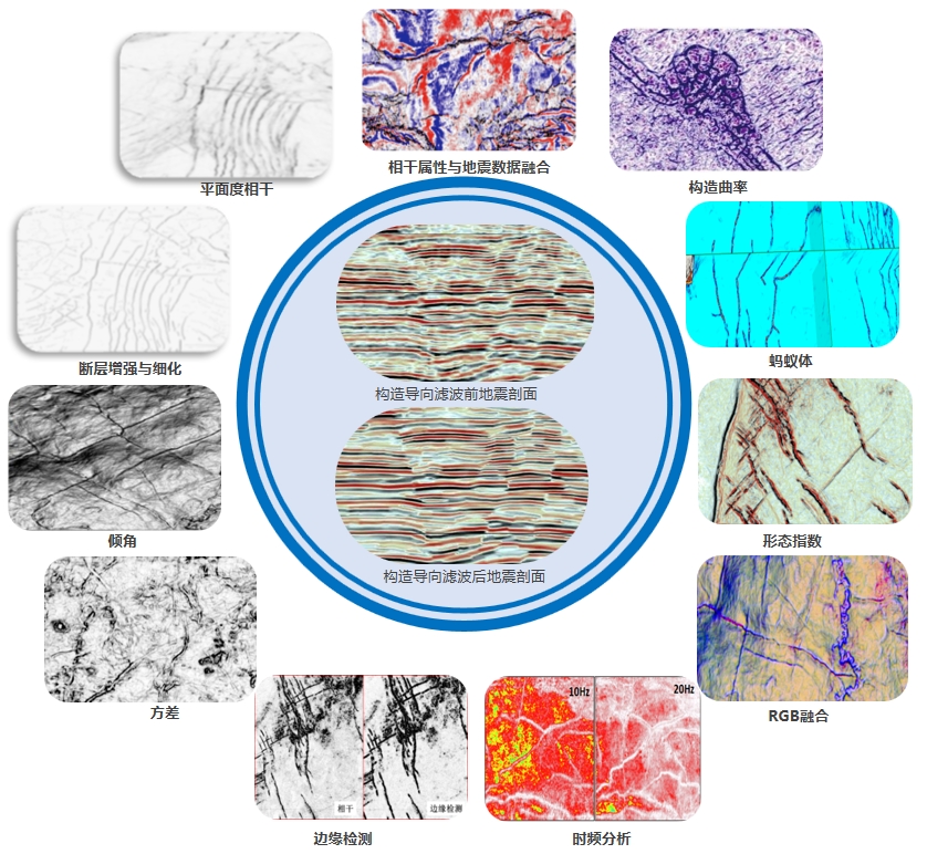提供剖面/切片断层解释、断面实时生成、自动标识断层上下盘、断层自动组合等功能,并具备多线剖面显示解释技术,可对比小断层在相邻多个剖面的变化规律,保障小断层解释精度。提供多种构造类属性,结合三维可视化实现断层自动追踪,提高断层解释效率。