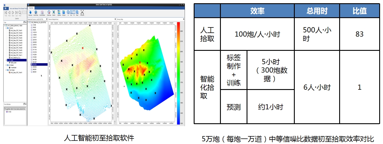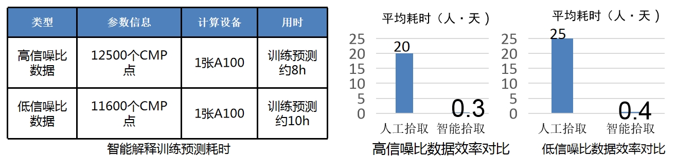 使用GPU节点实现模型训练及预测功能,分别应用某三维工区高信噪比数据687平方公里约12500个CMP点与某复杂三维工区低信噪比数据432平方公里约11600个CMP点进行智能解释训练预测耗时分别约8小时、10小时,人工解释均需约20个以上工作日,效率提升显著。