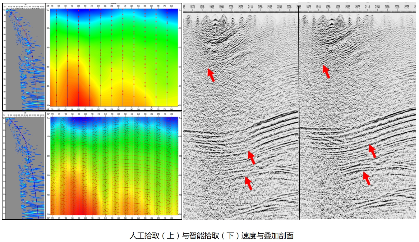 全交互智能化速度谱解释软件具备完整的标签制作、网络模型训练、速度智能拾取与质控编辑功能,采用人工智能多信息融合速度趋势预测技术,突破了低信噪比数据速度谱弱能量反射区域内拾取准确度低的难点,通过样本标签数据进行模型训练及预测功能,可适用于不同信噪比数据的速度谱自动解释工作,通过增加解释密度提高叠加剖面成像效果。
