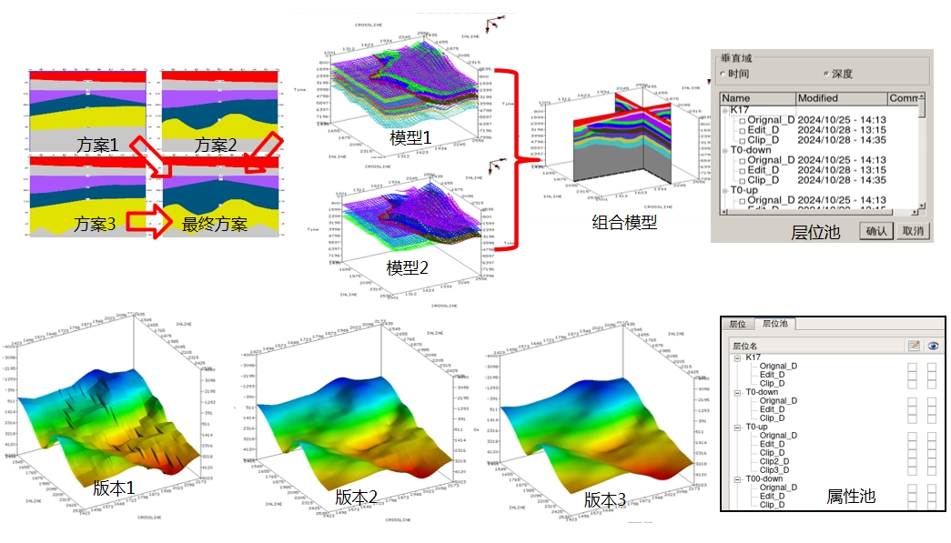 针对复杂勘探区建模过程中需要反复修改构造模型的问题,研发层位池及属性池功能实现解释成果高效管理,并开发更灵活的交互操作模式及可视化质控工具,形成协同式建模技术序列,实现复杂区高效、灵活建模。