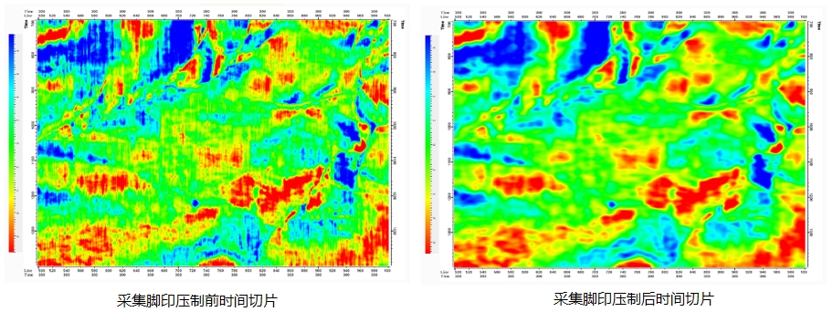 针对陆地与海洋采集脚印压制难题,采用克里金滤波方法沿地震切片对采集脚印进行有效压制,提高地震数据信噪比。