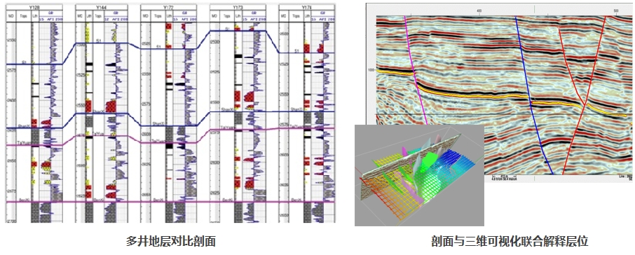 具备高精度地震地质标定、多井对比等功能,并提供四种层位自动追踪方法,可在剖面和空间实现层位自动追踪,满足不同品质地震数据的快速层位解释。采用剖面与三维可视化联合解释等技术,提高层位解释的精度与效率。