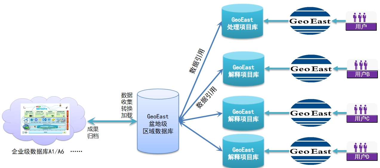 (2)新的工作模式:构建真正的盆地级区域数据库,各项目数据库通过引用方式使用数据无需拷贝复制,彻底解决了反复加载、多副本、多坐标系、数据不一致、难以共享、工作环境混乱等各种问题。