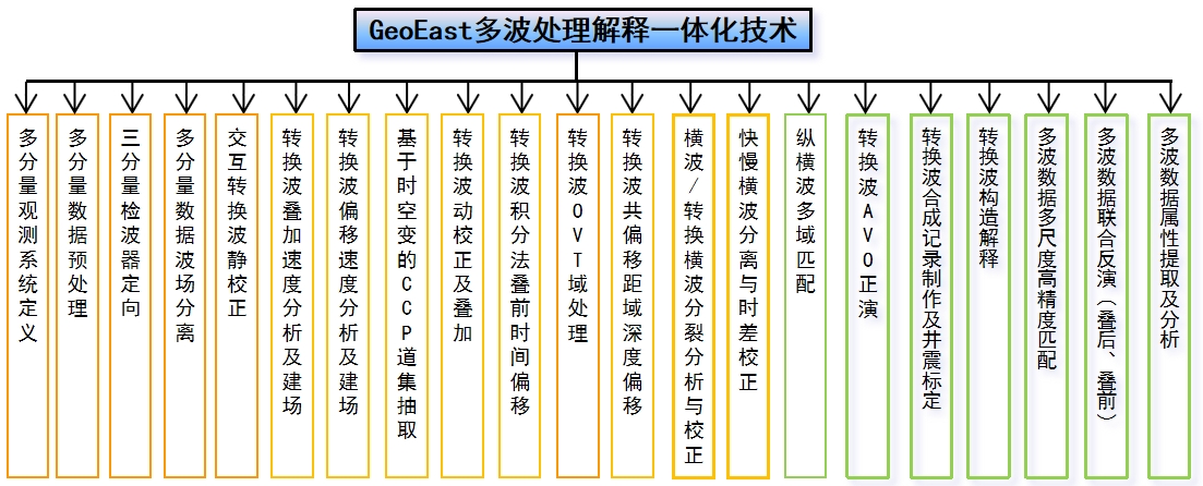 GeoEast系统具备完整的多波资料处理功能,包括多分量数据预处理、转换波静校正、基于时空变速度比共转换点道集抽取、三分量检波器定向分析与质控、VTI各向异性多参数迭代分析、方位各向异性参数估计、VTI各向异性叠前时间/深度偏移建模与偏移、横波分裂分析与补偿、多分量层位匹配等技术,能够满足致密砂岩、碳酸盐岩、页岩气、重油等不同类型油气藏勘探的处理需求。