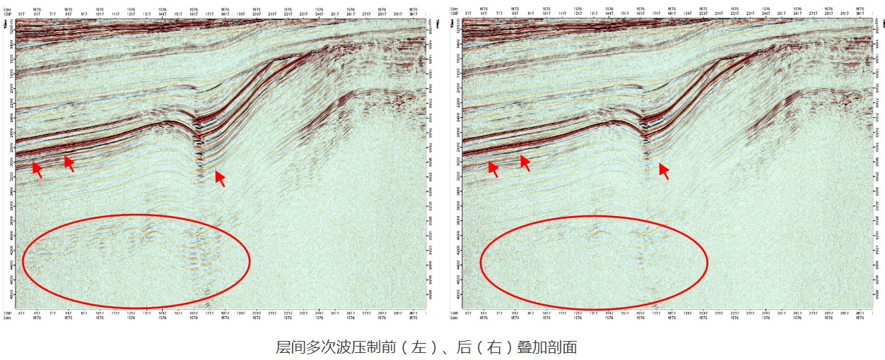 扩展层间多次波和基于层位的层间多次波预测技术,能够预测和压制地下强反射层产生的层间多次波,有效提高成像精度。