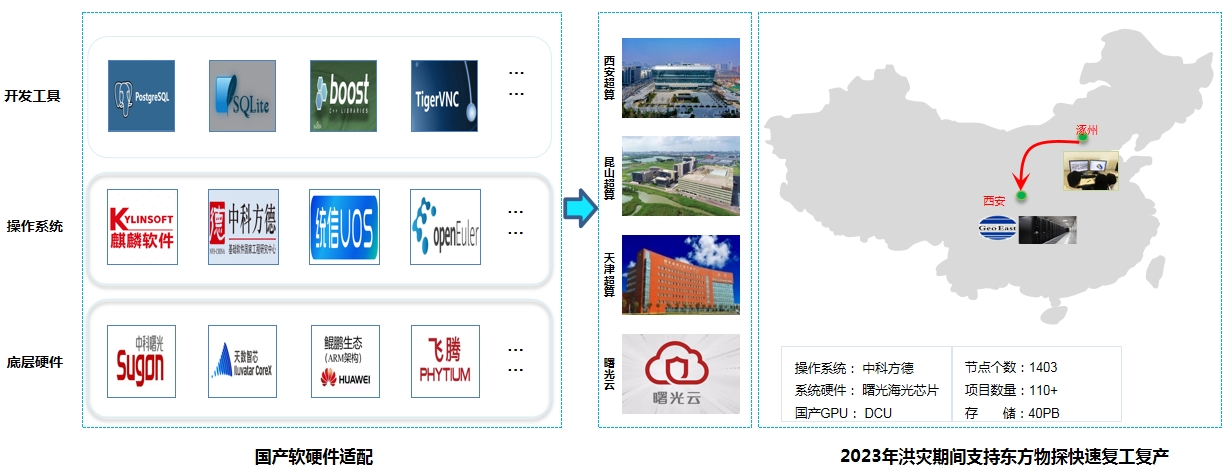 2023年涿州洪灾期间,GeoEast国产软硬件适配版本支撑东方物探110多个处理项目在西安超算顺利运行,实现了快速复工复产,有效减少洪灾对生产的影响。