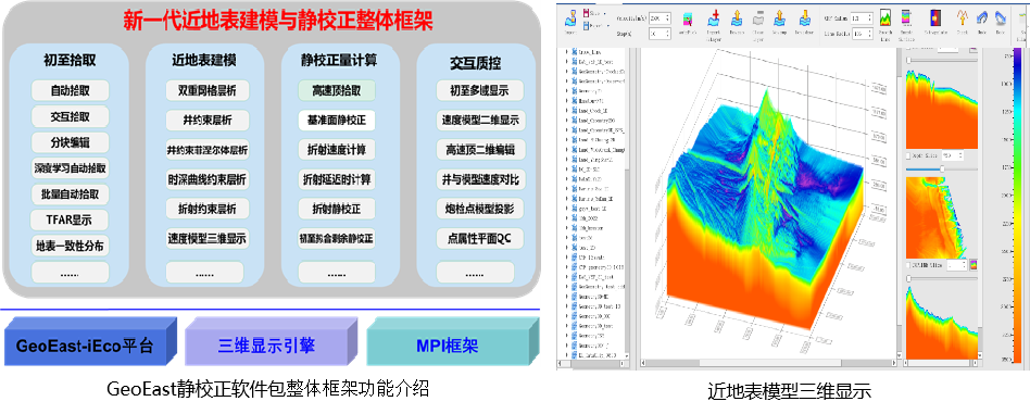 GeoEast系统已经形成以低信噪比数据初至拾取、折射波静校正、微测井约束层析静校正、数据驱动初至波剩余静校正、非线性反射波剩余静校正等为代表的一整套功能完备、技术成熟的静校正技术系列,有效解决山地、沙漠和黄土塬等复杂地表引起的静校正问题,提高成像质量。