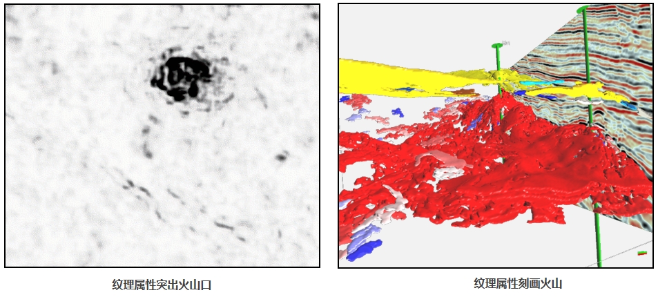 利用纹理、振幅差异、高亮体等属性,突出火山岩反射特征,并通过三维可视化地质体追踪技术雕刻火山机构,完成形态刻画及储层评价。