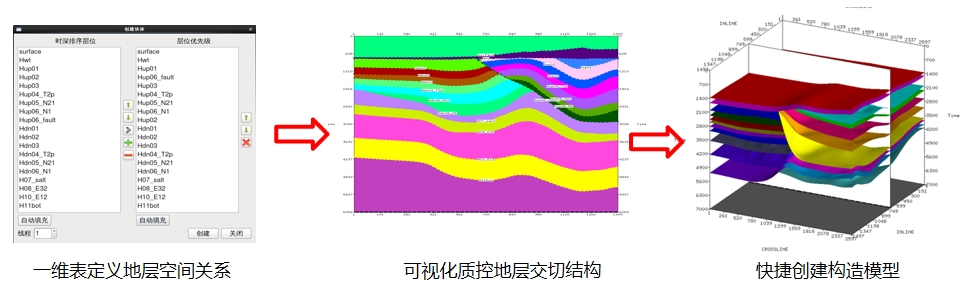 新增一维表模式,依据地层演化次序灵活定义层位空间关系,直观质控地层空间交切关系,可有效应对复杂勘探区地层多类型发育构造建模难题。