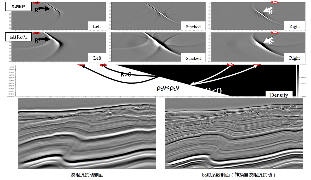 突破传统的叠加反射率图像,利用逆时偏移直接反演波阻抗扰动,该技术解决了高陡构造情况下,多射线路径导致的极性反转问题,可从波阻抗扰动提取更加准确的反射系数。
