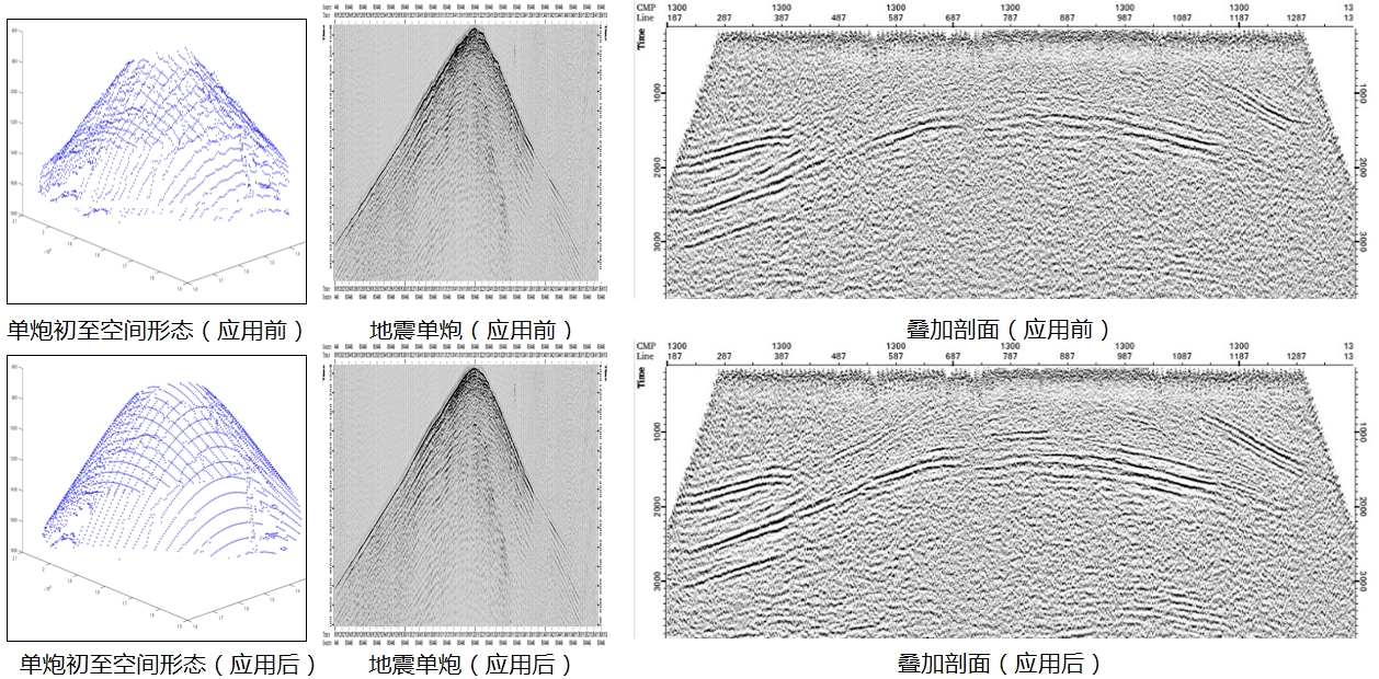 对单炮初至在炮域和检波点域分别拟合出空间最优曲面并分解计算。较好解决了应用长波长静校正量后单炮初至的抖动、扭曲和反射波双曲特征连续性不强等问题。
