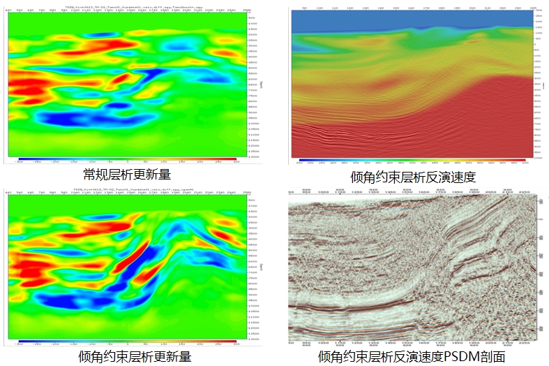 新增基于倾角约束的快速平滑算法,并集成到网格层析模块,实现较好的构造导向速度反演,帮助复杂高陡构造探区建立更加符合地质意义的速度模型,西部实际资料测试取得了良好的效果。