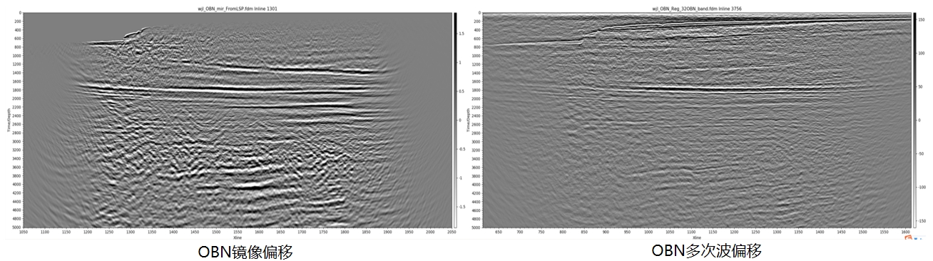 GeoEast具有节点二次定位、基于数据的三分量重定向、方向信号反褶积、模式识别和小波域Vz噪声压制、交叉鬼波上下行波场分离、OBN和拖缆联合多次波预测、双基准面建模和成像等技术,实现了从去噪、波场分离到成像的OBN纵波全流程处理。